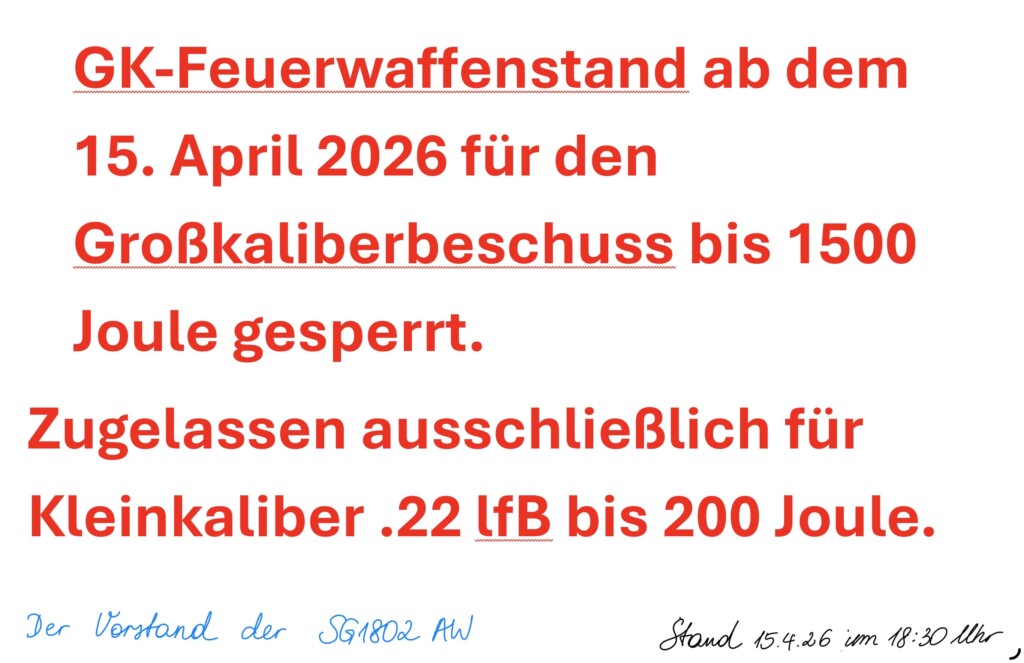 Bis zur offiziellen Abnahme der Instandsetzungsarbeiten gilt für den Großkaliber-Stand (GK):